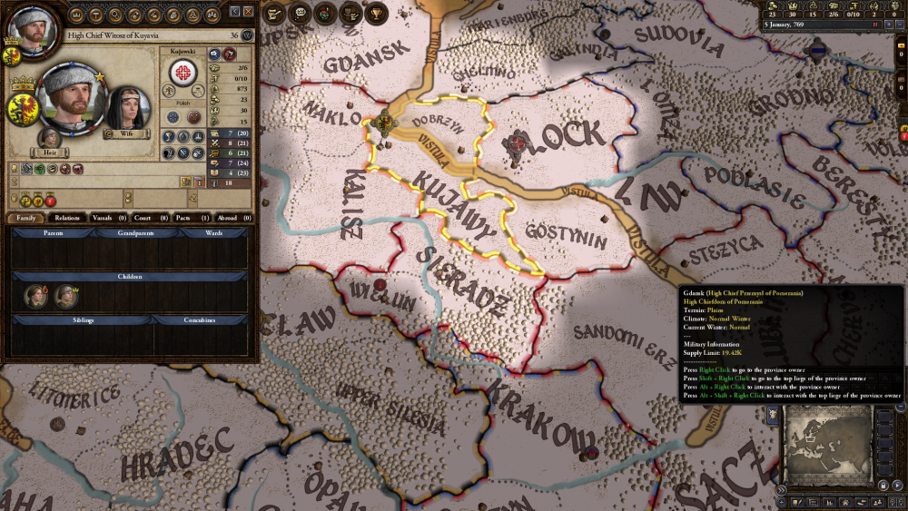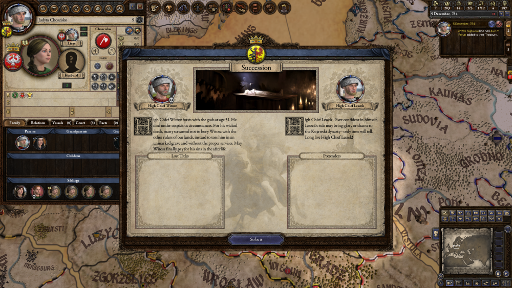 Ród Łudzki Główne DLC: Monks&Mystic, Horse Lord, Conclave, The Old Gods, Charlemange, Legacy of Rome, Customization Pack, The Reaper`s Due, Rajas of India, Swords of Islam, Ruler Designer. Tryb: Ironman Sędziej Łudzki (01.01.733 r. - 14.08.784 r.) Wódz Sieradza (01.01.749 r. - 14.08.784 r.) Lodziowie pieczętują się następującym herbem, złoty smok na czerwonym polu. Mapa Sędziej jest osobą tchórzliwą, samowolną, dumną a także ma skłonności paranoidalne. Posiada podstawową wiedzę teologiczną. W dniu 13.01.769 r., bierze ślub z kapłanką Grażyną ze Świątyni Oliwskiej. Żona Sędzieja jest w ciąży, lecz Sędziej nakazuje sprawdzić, czy to jego dziecko. Okazuje się, że jego. W dniu 01.03.771 rodzi się następca tronu, Gerward. Grażyna po raz kolejny zachodzi w ciążę, Sędziej z radości za namową Gierołta orgaznizuje wyprawę handlową do hrabstwa Deasmhumhain. Zakończyła się ona sukcesem. Grażyna rodzi córkę, Ludwinię w dniu 01.03.773 roku. Sędziwój spodziewa się trzeciego dziecka, już wierzy, że to jego dziecko. W dniu 01.04.774 roku rodzi się druga córka, Kalina. Poddani nawyzywają Sędzieja - Przebiegłym. Sędziej dla ukojenia nerwów samodzielnie buduje ogród i zostaje ogrodnikiem. Sędziej bardzo dobrze rządzi na Ziemi Sieradzkiej. Miesięczny dochód to 0,76 grosza. Po uzbieraniu 310 groszy, wzmocnieniu zamków, Sędziej rusza do boju o Kujawy. Niestety po początkowym sukcesje, następuje porażka. Tym większa, że do walki włączyło się wodzostwo Galindi (część Wielkiego Wodzostwa Prus), i ona wygrywa wojnę. Sędziej zostaje z niczym. W trakcie walk, rodzi się trzecia córka Rikssa. Rok po zakończeniu walk, rodzi się drugi syn, Lutek Pakosławic Lodzia. Sędziej z Grażyną postanawiają zaręczyć najstarszą córkę Ludwinię (9 lat) z Wielkim Wodzem Krzesimirem z Pomorza, mającym 10 lat. Następnie zaręczę dziesięcioletniego Gerwarda z czteroletnią Aldoną, córką Wielkiego Wodza Ślężan Witosza. Sędziej w wieku 51 lat czuje ból w piersi, okazuje się, że to rak. Sędziej Przebiegły umiera 14.08.784 roku na raka.